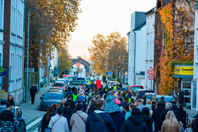 Anschließend begab man sich dann gemeinsam zur Hofackerstraße, wo der Zug sich (wie auch schon bei der ersten Ausgabe) formierte und schlussendlich auf den Weg machte. Angeführt von Sankt Martin hoch zu Ross, zogen viele bunte Laternen entlang der Lutherstraße, der Duisburger Straße und der Hansastraße.
