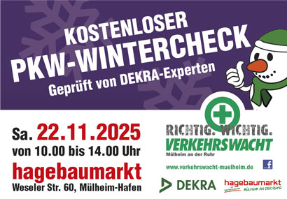 Wenn die dunkle Jahreszeit beginnt, steigen die Unfallzahlen im Straßenverkehr. Bei Glatteis, rutschigen Straßen und schlechter Sicht ist es daher wichtig, dass das Auto bestens gerüstet ist. Die Verkehrswacht Mülheim organisiert in Zusammenarbeit mit der DEKRA aus diesem Grund am 22. November einen kostenlosen PKW-Wintercheck an der Weseler Straße 60.